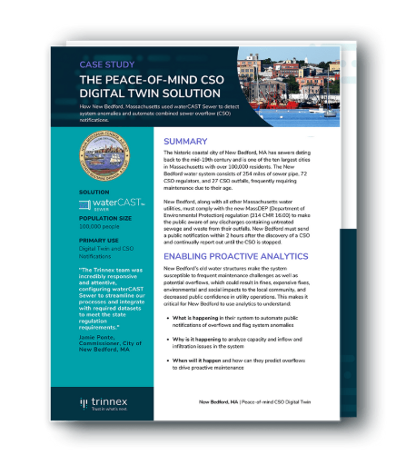 The City of New Bedford, MA sought a digital twin solution that could help them gain insight into the performance of their collection systems to proactively prepare and respond to the next extreme weather event as well as optimize Operations & Maintenance (O&M) activities.